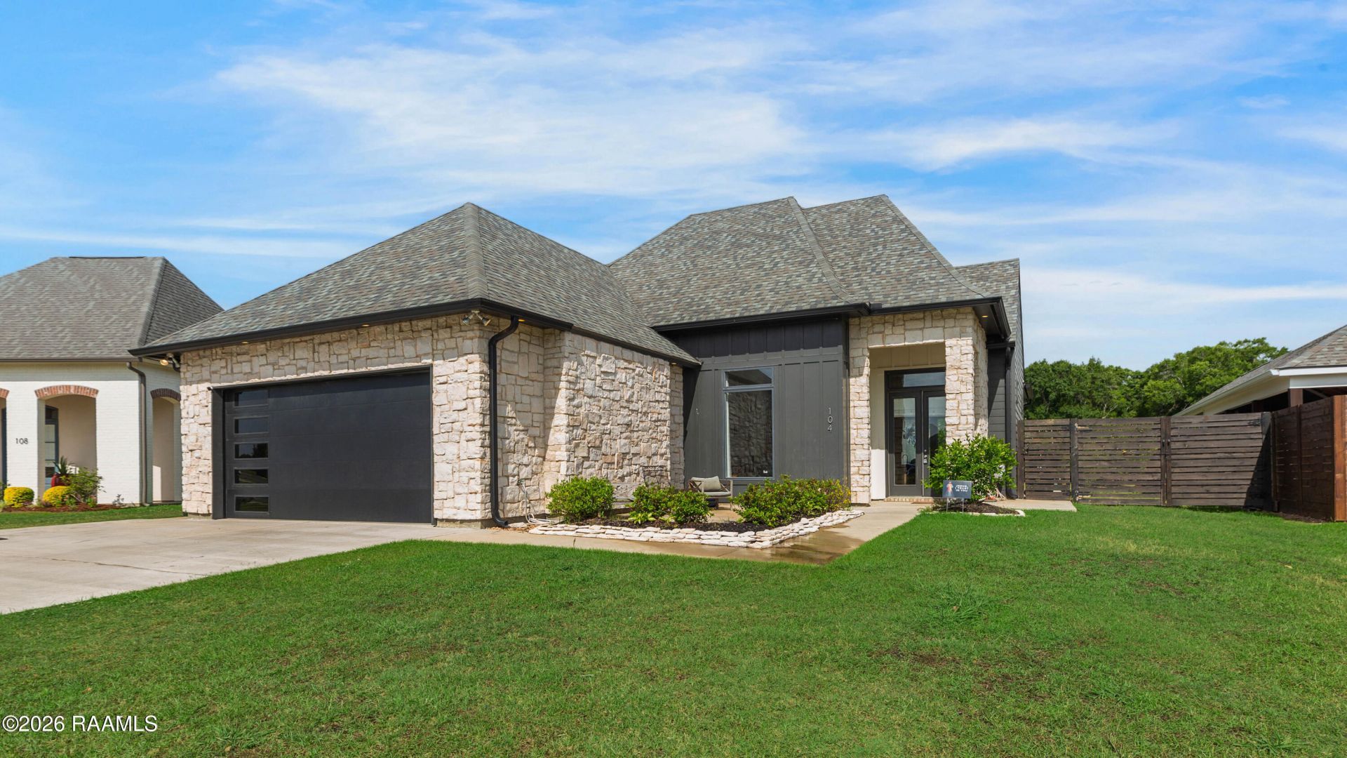 Welcome to this custom home on a pond lot with a fully equipped outdoor kitchen and thoughtfully selected finishes throughout! This home offers 3-bedrooms, 2.5-bathrooms and a dedicated office space! This property features water views, strong curb appeal, and functional upgrades inside and out. The backyard is designed for entertaining, featuring an extended patio and a complete outdoor kitchen with a 5-burner gas cooktop, blacktop griddle, sink, and mini fridge. The space is framed by a custom black-stained horizontal wood fence, creating a clean, modern look while maintaining the pond view. Inside, the home includes custom cabinetry throughout, designer lighting, and built-in shelving. The kitchen is designed for both everyday use and entertaining, with an under-counter induction cooktop, premium sink, and generous prep space. The primary suite includes a feature accent wall and a custom walk-in closet with built-ins for organization and storage. Additional features include a built-in CASPR air purification system integrated into the HVAC for continuous, whole-home air quality. Schedule your showing today in the Woodlands of Acadiana!